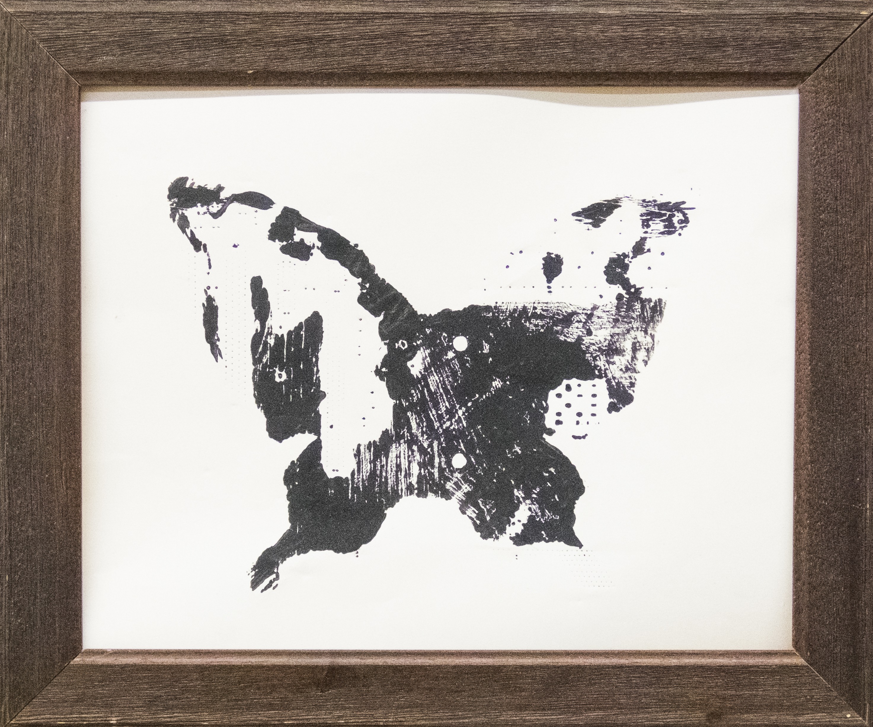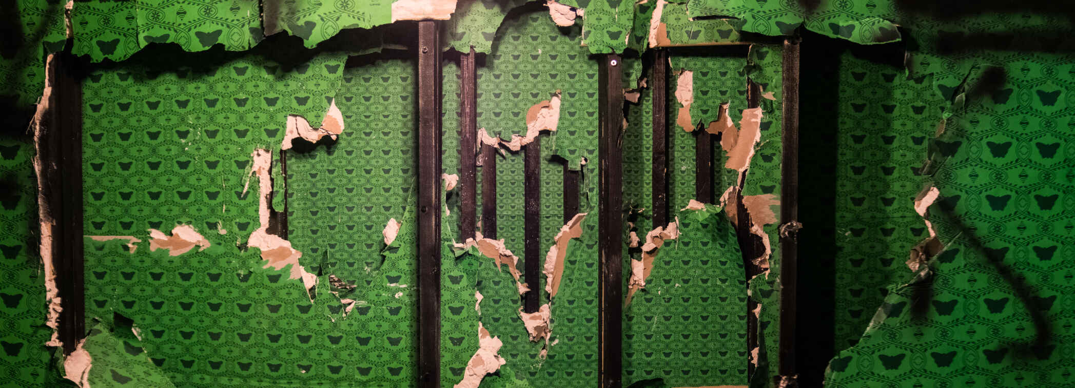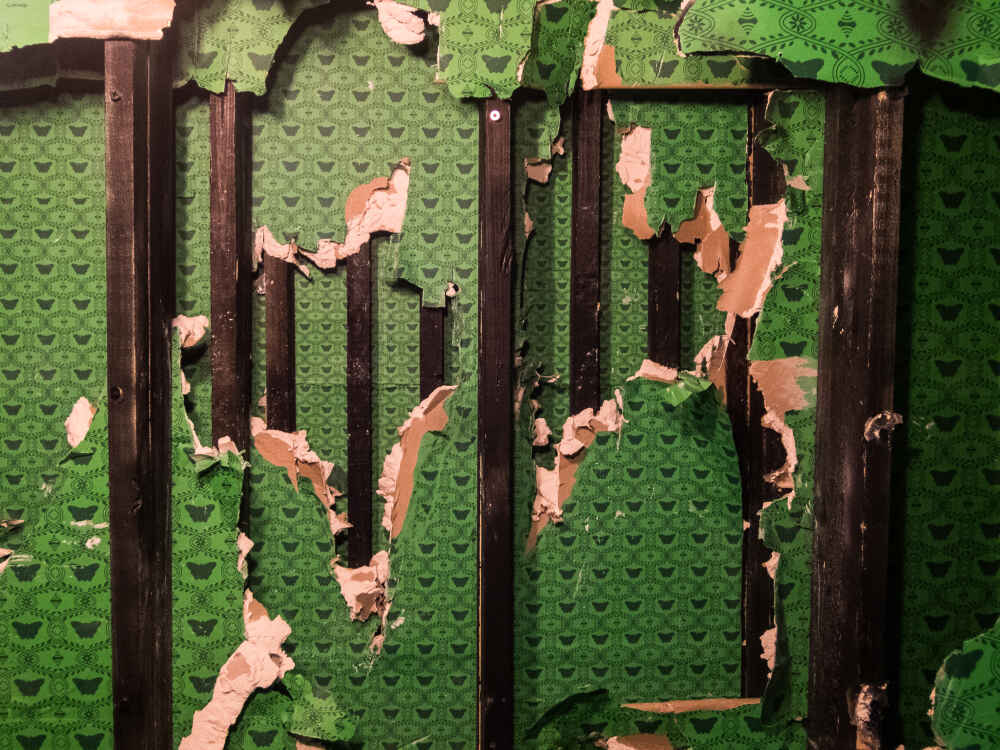 Die Wände durchzogen mit einem Tapetenmuster welches eine atmosphärische Funktion erfüllt aber auch symbolische Andeutungen, aus der technologisierten Gesellschaft mit sich trägt. So stellt aber der Schmetterling als Ambivalentem Symbol hier die Dominante, einerseits ein gewohntes Bild im Kitsch, dem angenehmen, andererseits ein Zeichen der Transformation und des Lebendigen, aufgehoben in seiner Wirkung durch die massive Wiederholung.