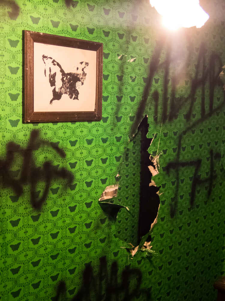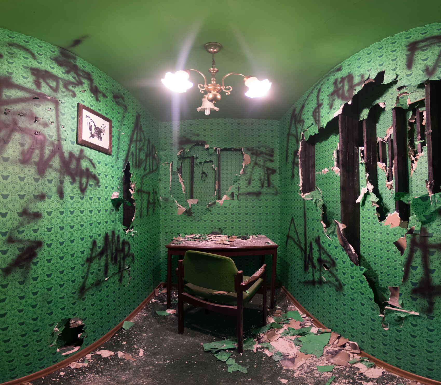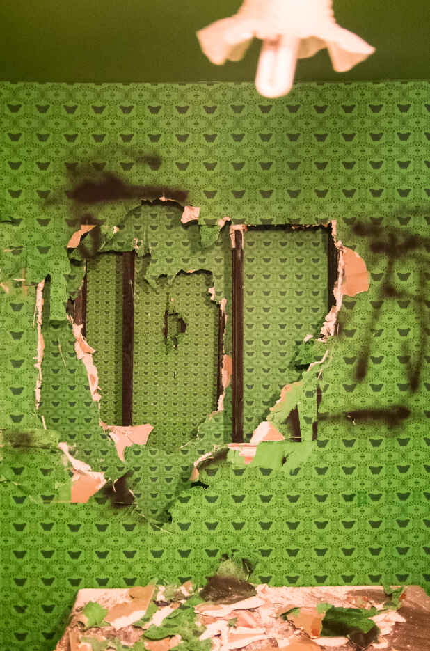 Den Bruch bildet lediglich das hängende Bild des technoid entstellten Schmetterlings. Hier beginnt die Empörung, erst auf rein Informativer ebene in Form von Graffiti und mündet letztendlich in der Zerstörung der einschließenden Wände nur um eine sich verdichtende Struktur , deren Raster nicht nachvollziehbar ist, vorzufinden. Dies schärft die Bedrohlichkeit und erweckt den Anschein einer Wand aus endlos vielen Schichten. Der Versuch endet im Frust , in einem Zwischenraum der weder Stabilität noch die Befreiung in sich trägt und einem Desaster gleicht.