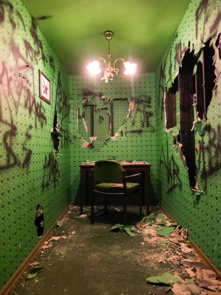 Den Ursprung bildet der Raum der drückenden Konformität, gestaltet in der Grauzone zwischen dem Glaubwürdigen und dem Grotesken. In der Gestaltung stark artifiziell dem Biedermeier nachempfunden. Die Dimensionierung an der Grenze dessen was ertragbar ist, aber niemals angenehm.